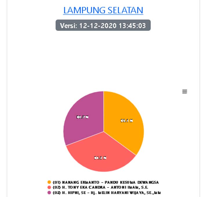 TERASLAMPUNG.COM — Empat hari setelah pencoblosan Pilkada Serentak 2020, penghitungan sura riil masih dilakukan di tingkat kelurahan/desa/pekon dan kecamatan. Sementara itu, KPU pusat masih terus memutakhirkan data (update) hasil pemungutan suara di tiap tempat pemungutan suara di Indonesia. Data yang diperbarui di situs KPU tersebut berdasarkan hasil penghitungan suara di TPS yang dikirim KPPS ke KPU berupa hasil foto formulir Model C.