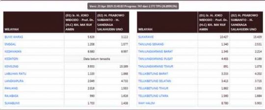 TERASLAMPUNG.COM — Hasil Sistem Penghitungan (Situng) Suara Pilpres 2019 di situs resmi KPU pada Selasa malam (23/4/2019) pukul 23.36 WIB menunjukkan bahwa data C1 740 TPS dari 2.777 TPS (26.64746%) sudah diinput. Hasilnya: Prabowo-Sandi meraih...