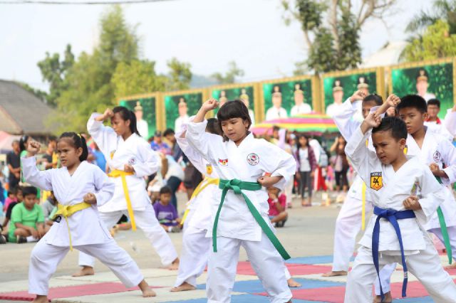 Putri sulung gubernur Lampung Andrea Ratu Sophia Ficardo (tengah) saat eksebisi karate di acara HAORNAS PKOR Way Halim, Minggu (27/9). BANDARLAMPUNG, Teraslampung.com—Ribuan peserta jalan sehat memadati Lapangan PKOR Wayhalim sejak Puk...