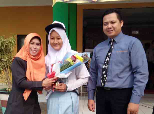 | Rizky Adinda (tengah) bersama bapak dan ibu guru SMP Global Surya Bandarlampng (Ist) |