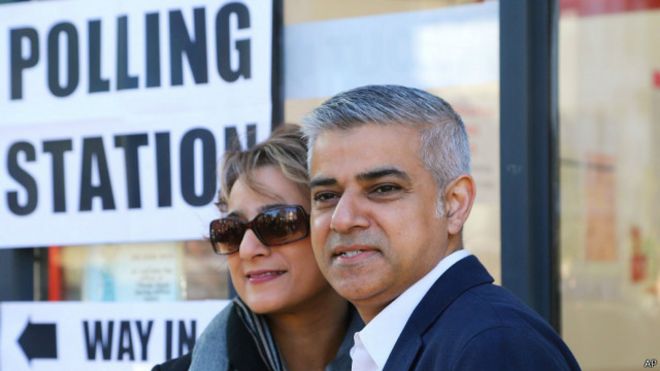 | Sadiq Khan bersama istrinya Saadiya setelah memberi suaranya Kamis (05/05). Foto: bbc.com |