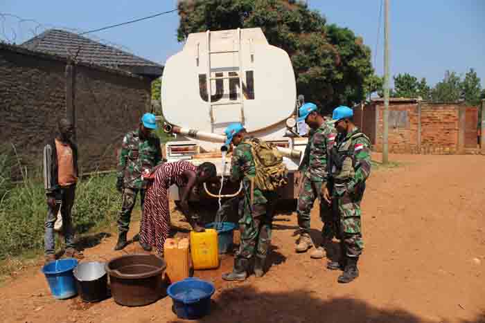 AFRIKA TENGAH, Teraslampung.com — Prajurit TNI yang tergabung dalam Satuan Tugas Kompi Zeni (Satgas Kizi) TNI Konga XXXVII-B/Minusca (Multi-Dimensional Integrated Stabilization Mission in Central African Republic) atau Indonesia Engineering Company (Indoengcoy) di bawah pimpinan Letkol Czi Denden Sumarlin S.E. selaku Komandan Satgas (Dansatgas), yang tengah melaksanakan tugas sebagai pasukan perdamaian PBB di Central Afrika Republik (CAR), memberikan bantuan logistik berupa air bersih bagi warga lokal di sekitar Camp Fidel, Bangui, Afrika Tengah, Selasa (5/1/2016).
