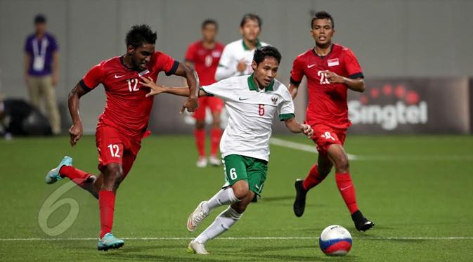 Evan Dimas, Zulfiandi dan Paolo Sitanggang menjaga keseimbangan permainan di lini tengah sekaligus meredam bola-bola panjang yang diterapkan tim Singapura yang dilatih Aide Iskandar. Babak pertama kedudukan imbang 0-0.