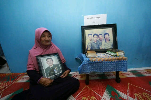 Nurhayati, bibi almarhum Kolonel Heri Setiadi,menunjukkan foto Kolonel Heri Setiadi berseragam militer. |