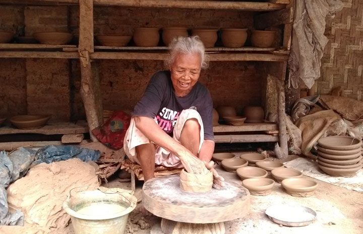 Tangan ibu ini, begitu cepat dan terlatih menggunakan alat sederhana yang dibuatnya sendiri untuk membentuk tanah liat menjadi berbagai bentuk barang perabot rumah tangga. Seperti gentong, kendi, cobek, anglo dan perabot rumah tangga lainnya dari tanah liat.