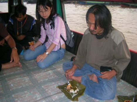 Setelah pose dan berfoto beberapa menit, kami—sekitar 30-an orang—pun segera berangkat menuju Pasar Terapung Muara Kuin. Kami menyewa dua perahu dengan harga Rp 150 ribu per perahu. Perjalanan dengan perahu motor dari dermaga di depan Masjid Surianyah hingga Pasar Apung Sungai Kuin menjadi perjalanan yang mendebarkan bagi siapa saja.