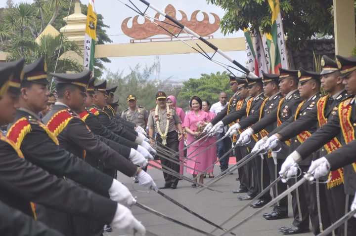 Kemudian laporan satuan (Lapsat) personel Polda Lampung dengan penyambutan pedang pora serta diiringi lagu “Selamat Datang Kapolda Lampung” yang dinyanyikan oleh para Polisi wanita (Polwan).