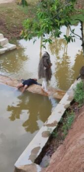 Mengambil lokus di area kebun karet dan sungai, setiap performer secara intens melakukan aksinya secara mandiri: Syamsul Arifin mengenakan jas terus menerus melahap makanan tanpa henti di atas meja berwarna merah, Riyadh terus menyadap karet dari bahan jadi, sementara Gilang bersenandung dengan suara besar dengan kostum defamiliar, seorang performer lain berbaring telungkup di sungai. Dari relasi peristiwa yang dimunculkan oleh setiap performer, karya ini bisa juga dibaca sebagai upaya mencipta satu sistem mitos baru.