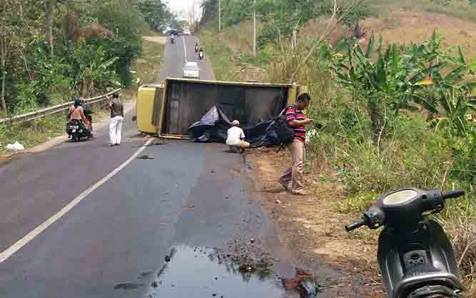 Sebuah truk pengangkut oli bekas terguling di Jl. Raden Imba Kesumaratu, dekat Lenbah Hijau, Bandarlampung, Rabu siang (7/10), sekitar pukul 12.30 WIB.