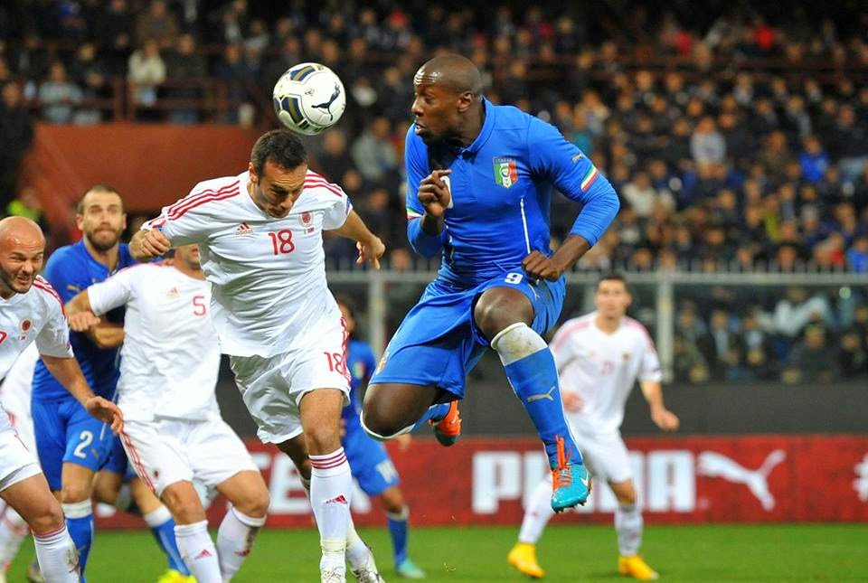“Duel” antara penyerang Italia, Okaka, dengan pemain Albania Hamdi Salihi berbuah gol bunuh diri. Italia unggul 1-0 atas Albania. (FB/FIGC) |