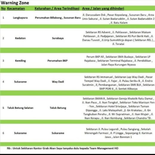 Namun, dalam versi lain yang diberi narasi, data tersebut terkonfirmasi sebagai milik ojek online Grab. Melalaui laman resminya, Grab Lampung woro-woro alias mengumumkan kepada para pengemudinya agar hati-hati jika order di kawasan merah atau red zone.