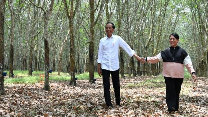 TERASLAMPUNG.COM — Presiden Joko Widodo dan istri, Iriana Jokowi, memamerkan kemesraannya di hadapan awak media. Jokowi menggandeng sang istri di tengah hutan karet di kawasan Banyuasin, Sumatera Selatan.