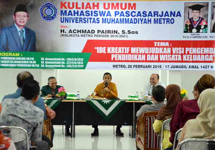METRO, Teraslampung.com — Walikota Metro Achmad Pairin memberikan kuliah umum mahasiswa Pasca Sarjana Universitas Muhamadiyah (UM) Metro di Aula Pasca Sarjana Universitas Muhammadiyah Metro, Jumrt (27/02/2016) pukul 14.00 WIB.