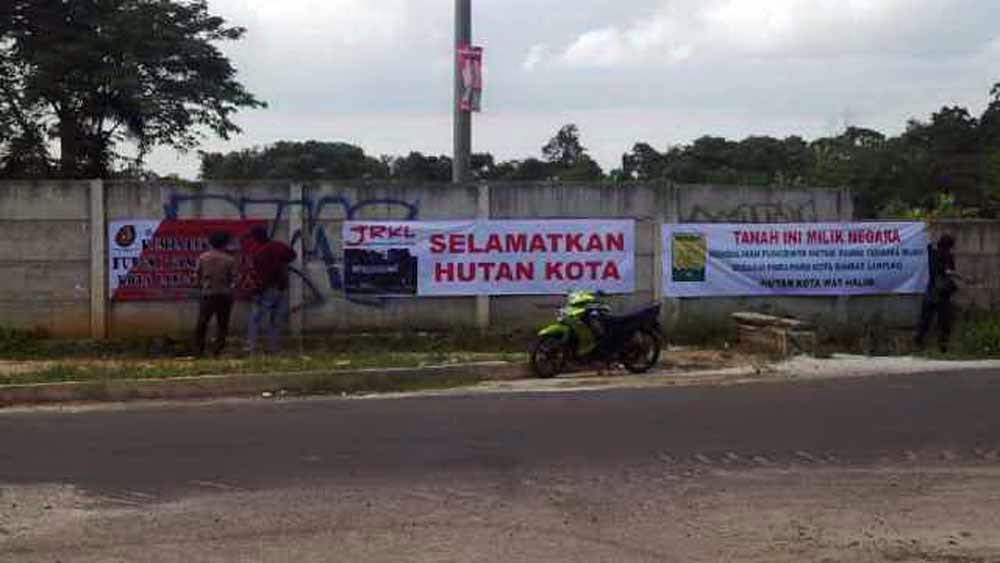BANDARLAMPUNG–Sejumlah spanduk berisi imbauan penyeleamatan Hutan Kota Bandarlampung kini terpampang di kompleks Hutan Kota, Way Halim, Bandarlampung. Spanduk itu antara lain ditempel oleh LBH Bandarlampung, Mitra Bentala, dan KPW PRD Lampung.