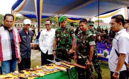 MESUJI, Teraslampung.com — Korem 043/Garuda Hitam kembali menerima 36 senjata api (senpi) ilegal dari masyarakat. Penyerahan senjata api secara sukarela itu melalui Kodim 0426/Tulangbawang di Lapangan Desa Buko Poso, Kecamatan Way Serdang, Rabu (24/02/2016).