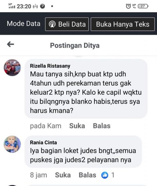 “Lapor bun, tolong untuk disdukcapil bagian loket ktp elektronik yang ramah, jangan mentang2 warga biasa judes2 ngasih penjelasannya,” ungkap pemilik akun FB Ditya Riyadi.