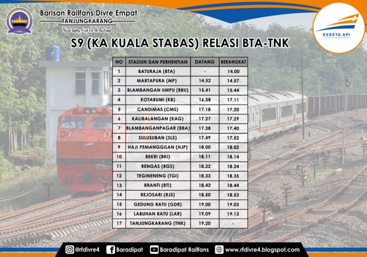 - KA S9 Baturaja brkt 14.00, Kotabumi brkt 17.11, Tanjungkarang tiba 19.10