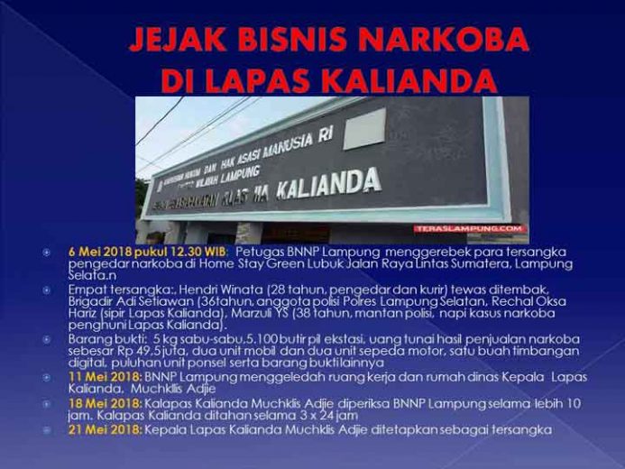 “Kepala Lapas Kalianda ditetapkan sebagai tersangka karena adanya dugaan aliran dana (bisnis narkoba) yang ditemukan di salah satu rekening bank miliknya,” tandas Kepala BNNP Lampung, Brigjen Pol Tagam Sinaga,Senin (21/5/2018).