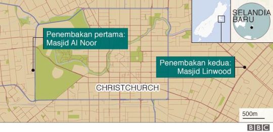 Penembakan pertama terjadi di Masjid Al Noor di pusat Kota Christchurch, sedangkan penembakan kedua di Masjid Linwood di pinggiran kota.