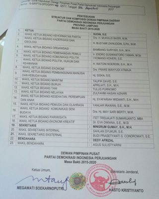 Berikut susunan lengkap pengurus DPD PDIP Lampung 2015-2020: